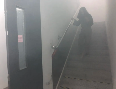 下午16時(shí),消防演練正式開(kāi)始。隨著火災(zāi)警報(bào)鈴聲響起,樓梯間濃煙彌漫,全體人員在安全員的指揮下用濕毛巾捂住口鼻,彎腰低頭,沿消防通道進(jìn)行緊急疏散。參與演練的人員第一時(shí)間撤離到5號(hào)樓外北側(cè)安全地帶,并進(jìn)行人員清點(diǎn)、確認(rèn)。