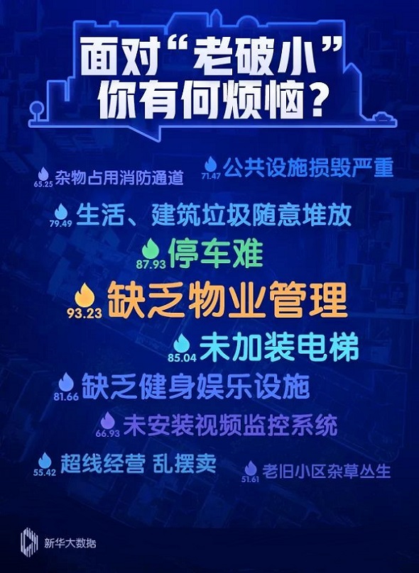 新華大數(shù)據(jù)顯示,與“老破小”相關(guān)的話題中,“缺乏物業(yè)管理”、“停車難”“未加裝電梯”等問題被提及次數(shù)最多,話題熱度分別達(dá)93.23、87.93和85.04。