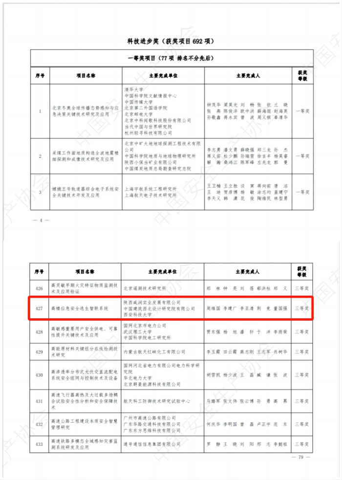 目前項目已累計申請國家專利51項(發(fā)明專利4項、實用新型專利34項、外觀設計專利13項)、計算機軟件著作權3項,先后入選陜西科技創(chuàng)新優(yōu)秀案例(列入優(yōu)秀案例合集)、西咸新區(qū)科技計劃社會發(fā)展類項目,連續(xù)2年被納入西安市應急管理科技創(chuàng)新重點工作任務,以該項目為基礎的2項地方標準《高層建筑緊急逃生設施應用技術規(guī)程》和《高層建筑緊急逃生固定設施構造圖集》在陜西省住房和城鄉(xiāng)建設廳完成立項審批。經陜西省科學技術廳組織技術鑒定,成果評價為“國際領先”水平、填補行業(yè)空白。