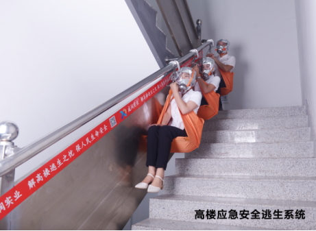 “高樓應急安全逃生系統”根據建筑高的特點,結合消防救援安全相關需求,通過改造高層建筑原有樓梯扶手,在火災、地震發生時,被困人員借助扶手懸掛逃生器,通過人體重力,以每秒0.8-1.2米的速度可勻速下滑,起到快速逃生的作用,老弱婦幼等所有人群都可使用。
