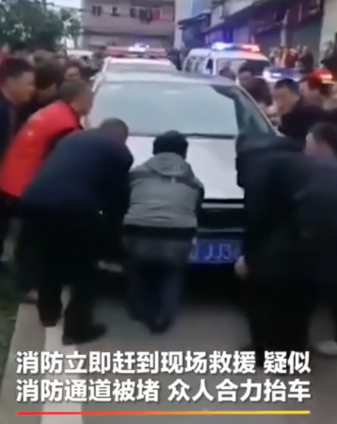 火情發(fā)生后,當(dāng)?shù)叵谰仍牭谝粫r間趕到小區(qū),可由于消防通道被堵導(dǎo)致消防車難以駛?cè)搿默F(xiàn)場視頻可以看到,小區(qū)居民正在合力抬一輛私家車,為消防車開辟救援通道。一個多小時后明火被撲滅,但最終導(dǎo)致6人死亡。