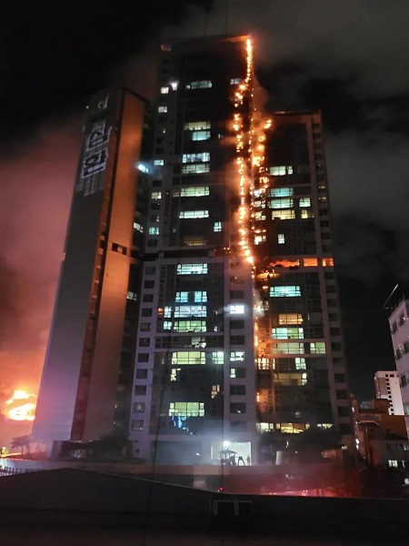 據(jù)韓聯(lián)社報道,韓國蔚山市一棟33層的商住樓8日晚11時7分許發(fā)生大火。經(jīng)過13個半小時的撲救工作,外部的明火已經(jīng)被撲滅,消防人員正繼續(xù)清理火災(zāi)隱患。
