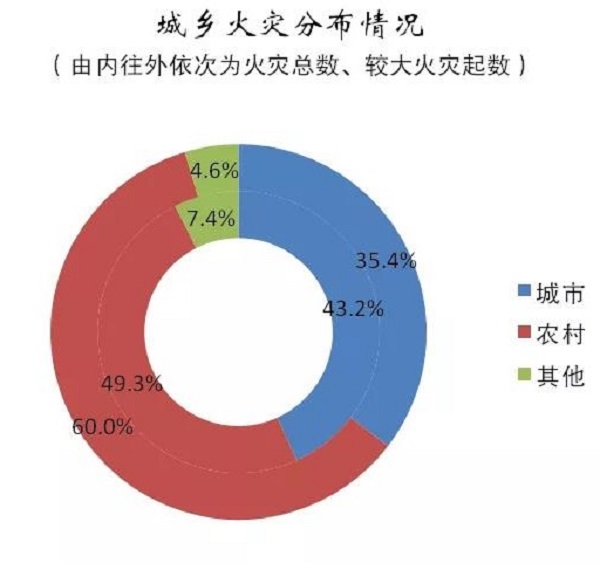 從城鄉(xiāng)火災(zāi)的分布看,全年農(nóng)村地區(qū)共發(fā)生火災(zāi)12.4萬起,占總起數(shù)的49.3%,比城鎮(zhèn)高出6.1個百分點,造成損失19.2億元,占總損失的48.1%,比城鎮(zhèn)高出12.2個百分點,火災(zāi)基數(shù)仍然較大;特別是農(nóng)村地區(qū)共發(fā)生較大火災(zāi)39起,占總數(shù)的60%,比城鎮(zhèn)高出近七成。