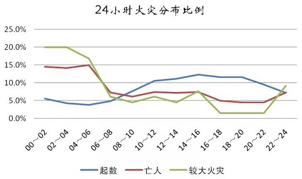 從火災(zāi)的時段分布看,夜間是全天火災(zāi)低谷,但由于發(fā)現(xiàn)晚、報警晚、處置晚,往往易造成傷亡,尤其0時至6時的火災(zāi),只占全天的13.7%,但亡人數(shù)占43.6%,較大火災(zāi)數(shù)則占56.9%。
